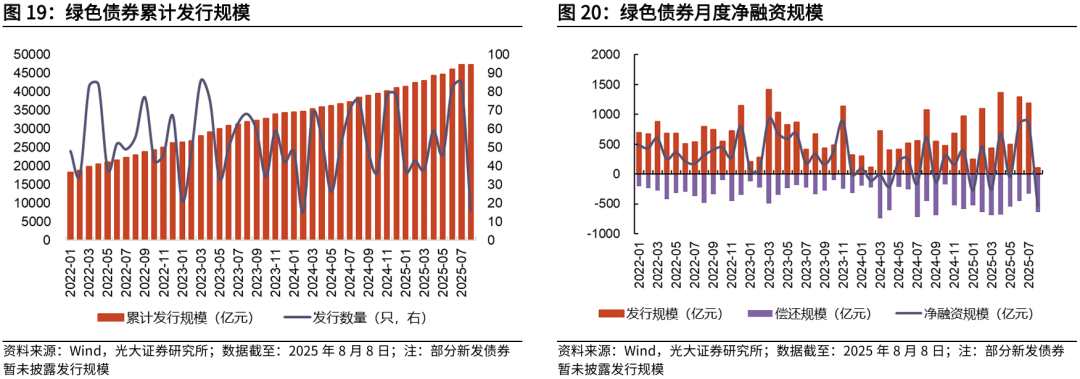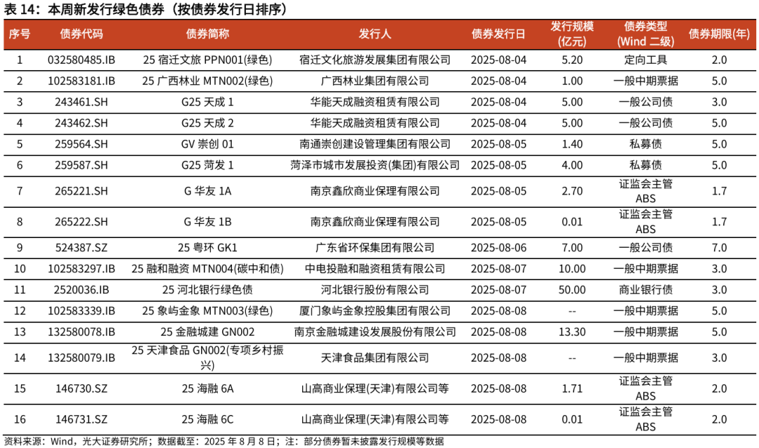 ESG金融产品跟踪:本周新发行绿色债券16只,已发行规模合计106.33亿元。国内绿色债券市场稳步发展,截至2025年8月8日,绿色债券市场累计发行规模合计4.73万亿元,发行数量合计4044只。