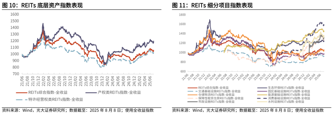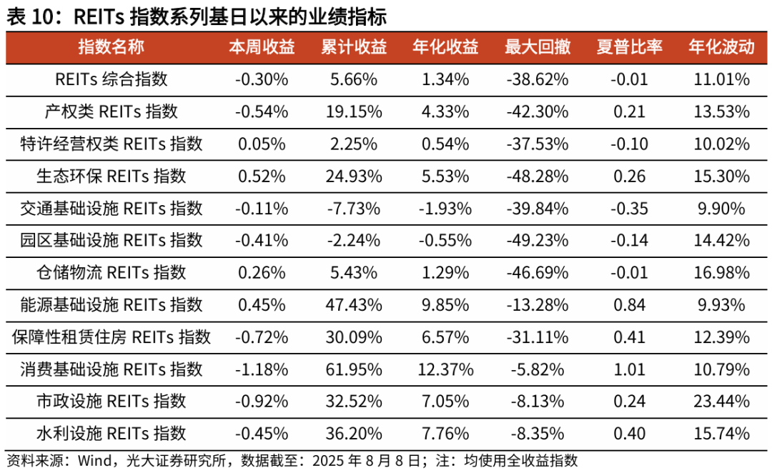 截至2025年8月8日,本周REITs市场震荡下行,REITs综合指数下跌0.30%。底层资产指数方面,产权类REITs指数下跌0.54%,特许经营权类REITs指数上涨0.05%。细分项目指数方面,生态环保REITs指数相对占优,上涨0.52%。