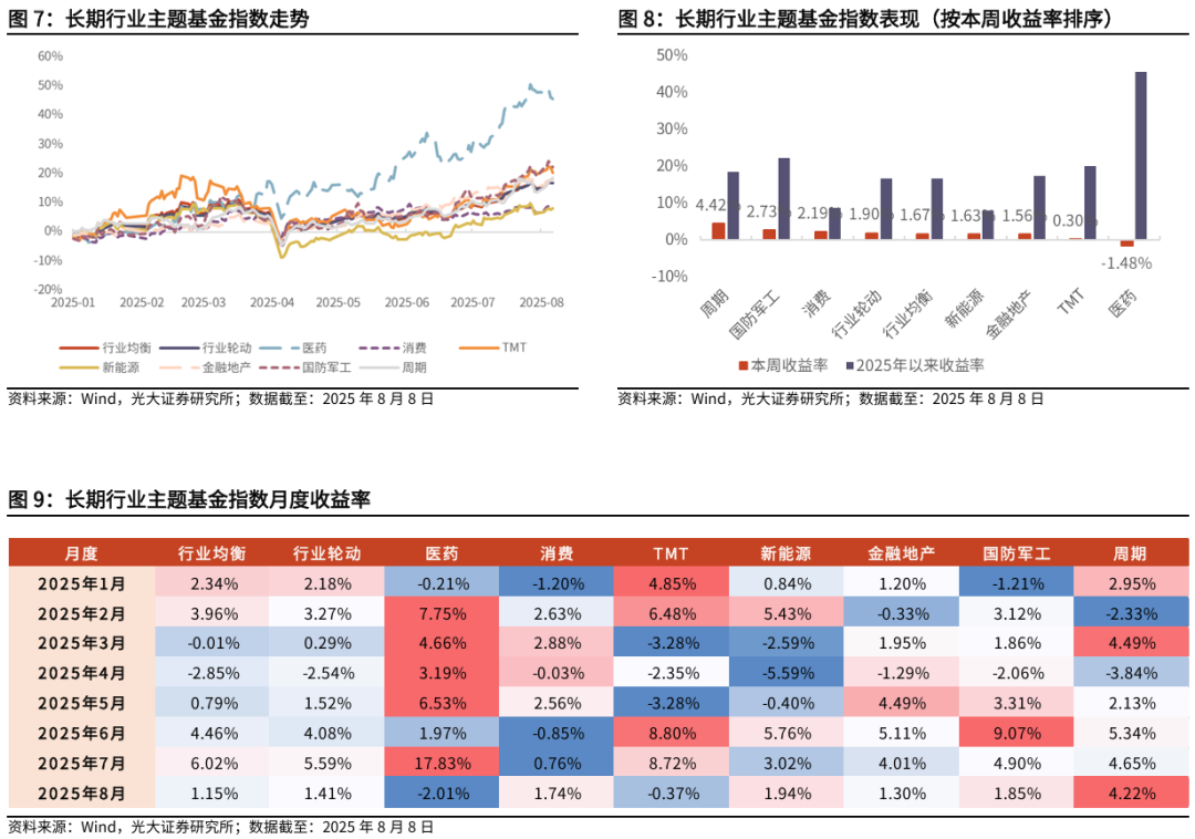 基金产品表现跟踪:行业主题基金方面,近期各板块基金轮动表现,本周除医药主题外,其余各主题基金均呈现上涨,周期主题基金表现占优,净值上涨4.42%。截至2025年8月8日,周期、国防军工、消费、行业轮动、行业均衡、新能源、金融地产、TMT、医药主题基金涨跌幅分别为4.42%、2.73%、2.19%、1.90%、1.67%、1.63%、1.56%、0.30%、-1.48%。