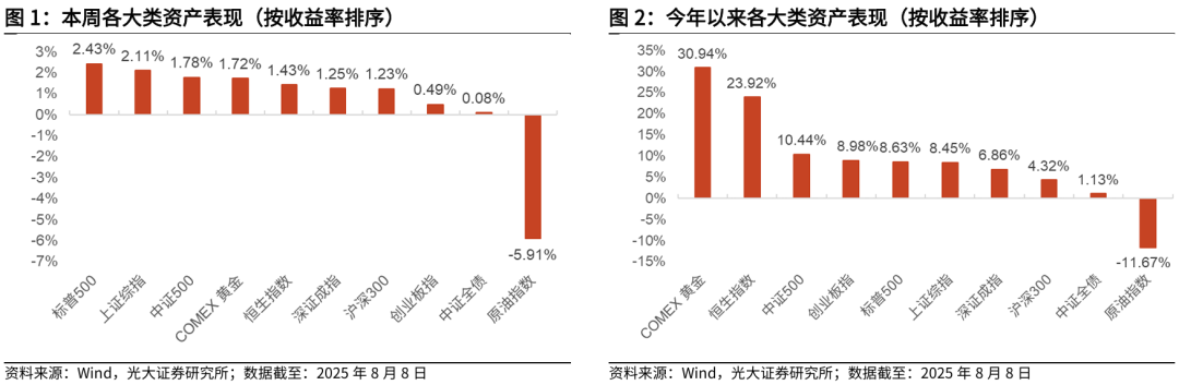 大类资产方面,本周(下文如无特殊说明,本周均指代2025.8.4-2025.8.8)国内权益市场指数集体上涨,原油价格大跌。具体来看,标普500上涨2.43%、上证综指上涨2.11%、中证500上涨1.78%、COMEX 黄金上涨1.72%、恒生指数上涨1.43%、深证成指上涨1.25%、沪深300上涨1.23%、创业板指上涨0.49%、中证全债上涨0.08%、原油指数下跌5.91%。