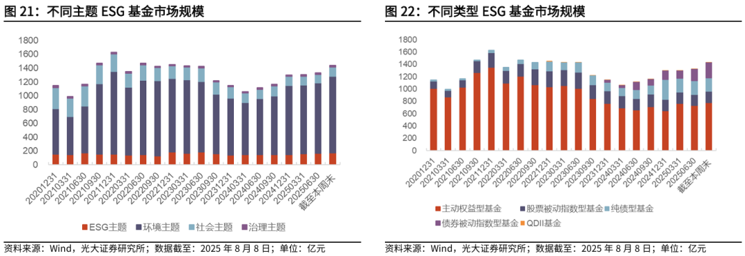 截至2025年8月8日,国内基金市场存量ESG基金共213只,规模合计1437.48亿元。分不同主题来看,ESG基金以环境主题基金为主,ESG主题、环境主题、社会主题、治理主题基金规模分别合计168.68、1112.58、132.88、23.34亿元。分不同类型来看,债券型基金在ESG基金中的占比逐渐提升,主动权益型、股票被动指数型、纯债型、债券被动指数型、QDII型ESG基金规模分别合计780.34、179.45、222.44、249.51、5.73亿元。