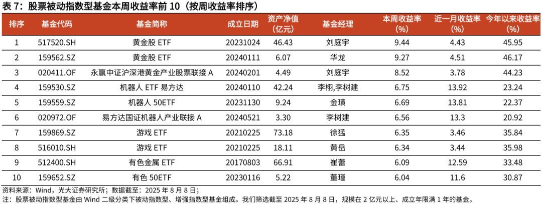 被动指数基金方面,本周黄金股、机器人等主题产品净值表现占优。股票被动指数型基金的净值涨跌幅中位数为1.29%,其中黄金股、机器人、有色、游戏ETF净值表现较好。