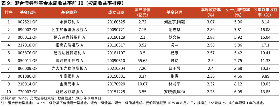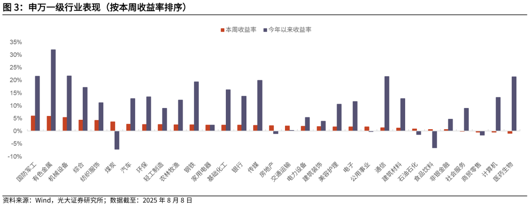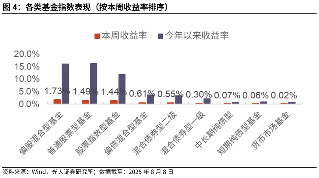 ]article_adlist-->摘要 ]article_adlist-->市场表现综述:大类资产方面,本周(下文如无特殊说明,本周均指代2025.8.4-2025.8.8)国内权益市场指数集体上涨,原油价格大跌。行业方面,本周各申万一级行业多数上涨,国防军工、有色金属、机械设备行业涨幅居前,医药生物、计算机、商贸零售行业跌幅居前。基金市场方面,本周权益市场表现较好,各类基金净值均呈现上涨,偏股混合型基金涨幅为1.73%。