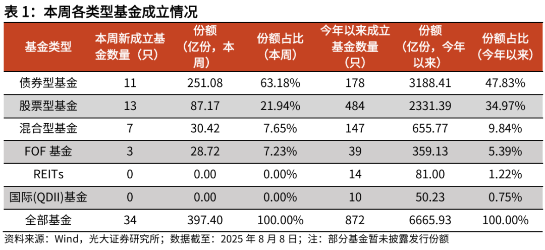 本周国内新基市场热度较高,新成立基金34只,合计发行份额为397.4亿份。其中债券型基金11只、股票型基金13只、混合型基金7只、FOF基金3只。本周新成立基金发行份额最大的是华安上海清算所0-5年政金债A(024519.OF),发行份额为59.9亿份,华安上海清算所0-5年政金债A为债券型基金。